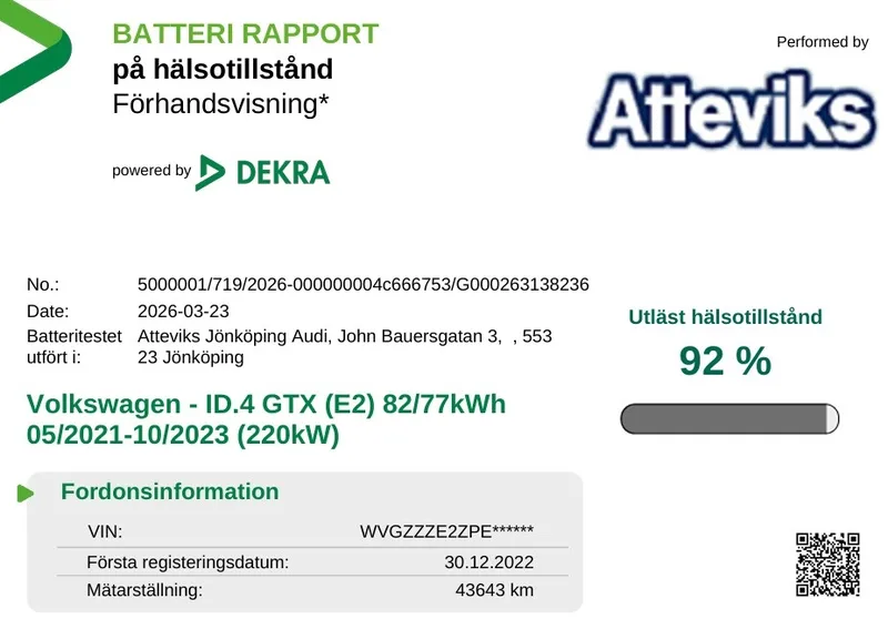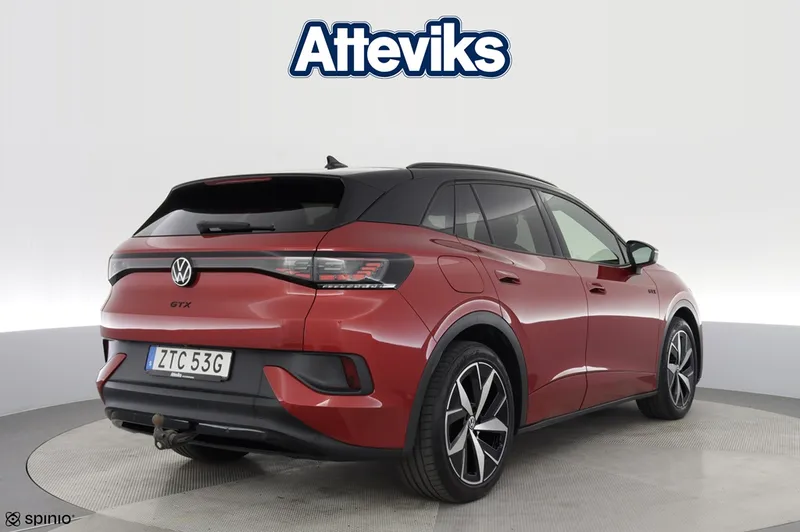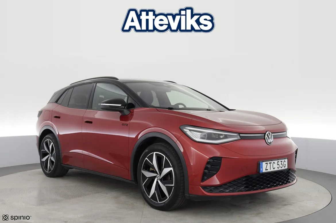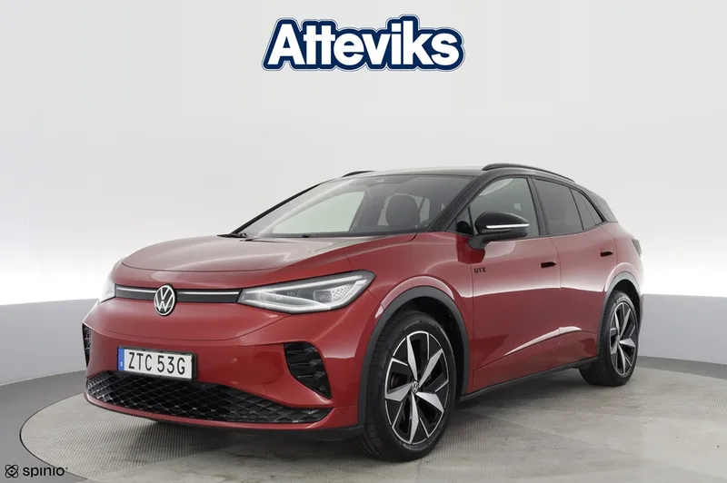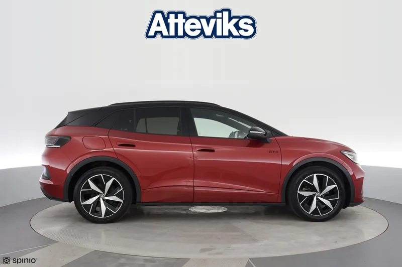 Nu har vi en riktigt fin och välutrustad Volkswagen ID.4 GTX i lager – en helelektrisk SUV som kombinerar stark prestanda med fyrhjulsdrift och imponerande komfort. Bilen är årsmodell 2023 och har gått 4 370 mil. Som elbil erbjuder den tyst och smidig körning med låga driftkostnader, samtidigt som 4MOTION fyrhjulsdrift och hela 299 hk ger kraftfull prestanda och trygg framkomlighet året runt. Perfekt för både vardag och längre resor. Denna bil är utrustad med bland annat 360-kamera som ger full överblick vid parkering, elbaklucka för smidig lastning, döda vinkeln-varning som ökar säkerheten samt utfällbart drag. Dessutom har bilen LED Matrix-strålkastare som ger optimal sikt och en modern körupplevelse. Bilen är även utrustad med det stora ljudpaketet inklusive subwoofer för en förstklassig ljudupplevelse. Utöver detta finns flera avancerade och bekväma funktioner som gör varje resa både enklare och mer trivsam. På Atteviks Begagnatcenter i Jönköping, beläget på John Bauergatan 1, erbjuder vi en trygg och smidig bilaffär med öppettider som passar din vardag. Vi har öppet måndag till fredag 9-18 och lördag 10-14. För frågor om denna bil är du varmt välkommen att kontakta ansvarig säljare Alexander Fäldt på 036-34 88 87 eller via e-post alexander.faldt@atteviks.se Hos oss får du flexibel finansiering, möjlighet att teckna serviceavtal och tillgång till ett brett utbud av tillbehör. Du kan även välja vår trygghetsgaranti på 6 till 36 månader, som gäller tills bilen når det första av 10 års ålder eller 20 000 mil. Kostnaden startar från 3 495 kr för 6 månader. Givetvis lämnar vi även kostnadsfri garanti enligt MRF-standard (Motorbranschens Riksförbund). Alla våra bilar är inbytestestade och varudeklarerade. På det annonserade priset tillkommer en registrerings- och administrationsavgift på 995 kr. Atteviks har varit verksamt i Jönköping sedan 1945, då Sigvard Attevik startade försäljning av Volkswagen. Företaget ägs och drivs fortfarande av familjen Attevik och står för lång erfarenhet, stark lokal förankring och ett väl inarbetat varumärke – vilket ger dig som kund en trygg och professionell bilaffär.