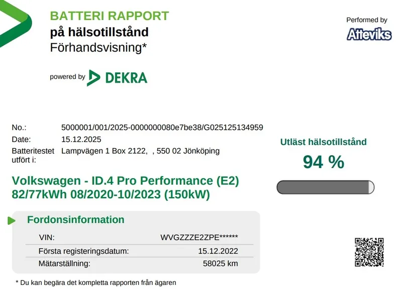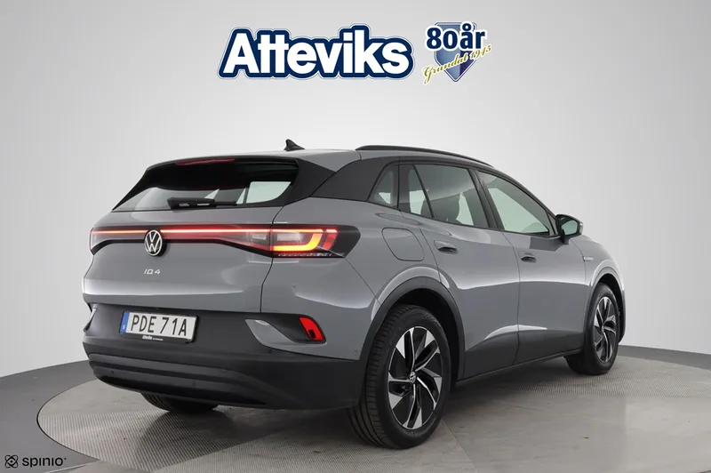 Just nu har vi en Volkswagen ID.4 Pro Performance 2023 i lager – en helelektrisk SUV som kombinerar modern teknik, hög komfort och lång räckvidd. Bilen är utrustad med Assistanspaket Plus som bland annat innehåller 360-kamera, döda vinkeln-varning och elektrisk baklucka, vilket ger både ökad säkerhet och smidigare vardagskörning. Ett genomtänkt och framtidssäkert val för dig som vill köra elbil utan kompromisser. På Atteviks Begagnatcenter i Jönköping, beläget på John Bauergatan 1, erbjuder vi en trygg och smidig bilaffär med öppettider som passar din vardag. Vi har öppet måndag till fredag 9–18 och lördag 10–14. För frågor om denna bil är du varmt välkommen att kontakta ansvarig säljare Alexander Fäldt på 036-34 88 87 eller via e-post alexander.faldt@atteviks.se Hos oss får du flexibel finansiering via Volkswagen Finans, möjlighet att teckna serviceavtal och tillgång till ett stort utbud av tillbehör. Du kan även välja vår trygghetsgaranti på 6 till 36 månader, som gäller tills bilen når det första av 10 års ålder eller 20 000 mil. Kostnaden för garantin startar på 3 495 kronor för 6 månader. Alla våra bilar är inbytestestade och varudeklarerade, och samtliga elbilar är dessutom batteritestade för extra trygghet. På det annonserade priset tillkommer en registrerings- och administrationsavgift på 995 kronor.